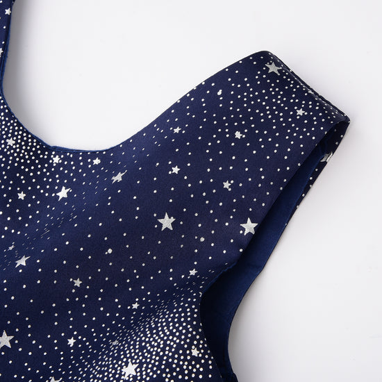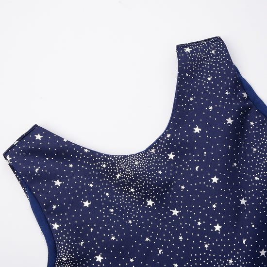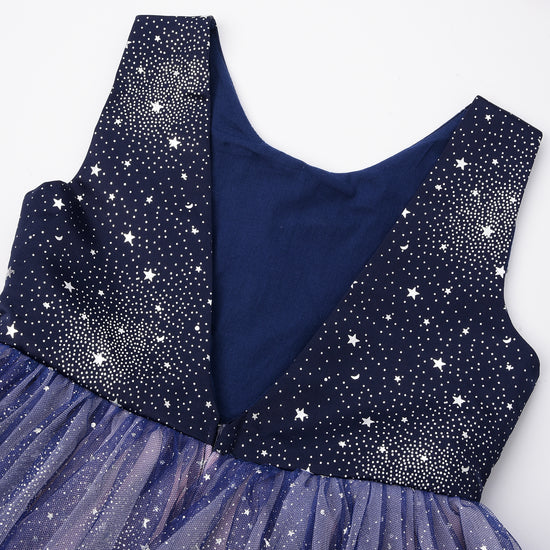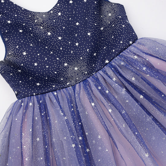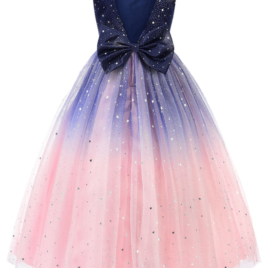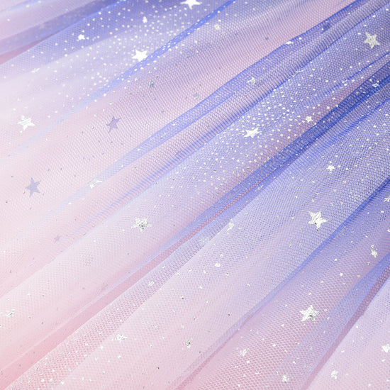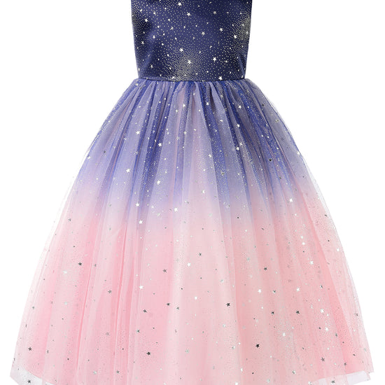 - 魅惑的なデザイン: このドレスは、ミッドナイトブルーからパステルピンクまでの見事なグラデーションが特徴で、光の中でキラキラと輝く星で飾られています。