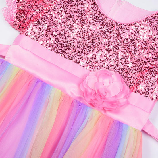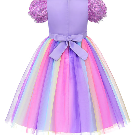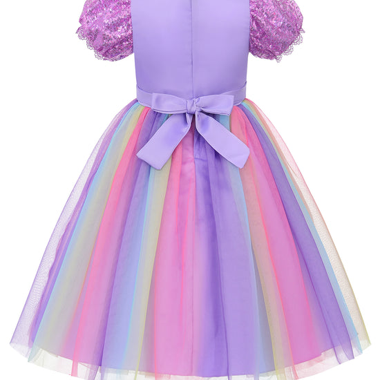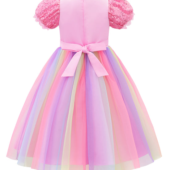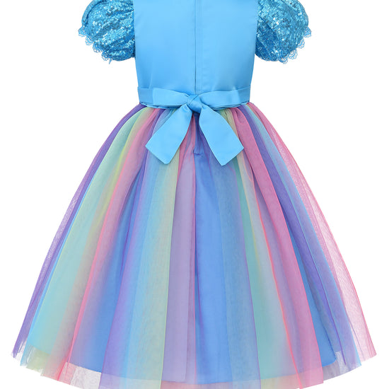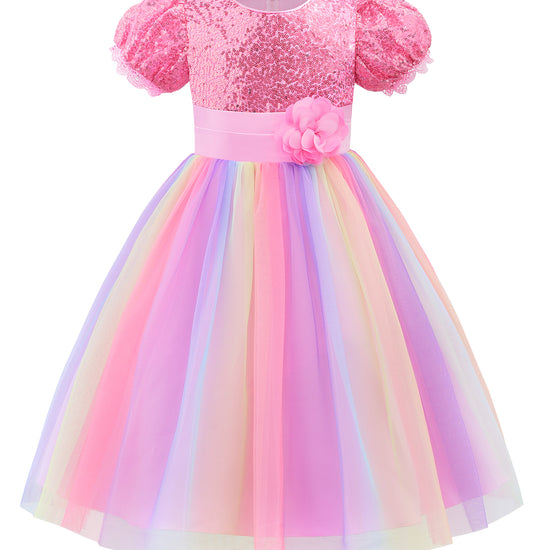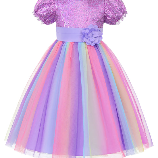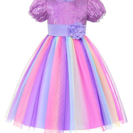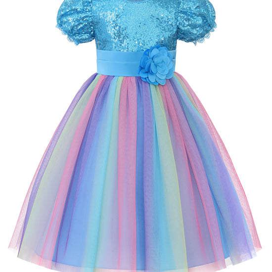 ウェディングパーティー用フラワーガールスパンコールドレスパフスリーブレインボードレス