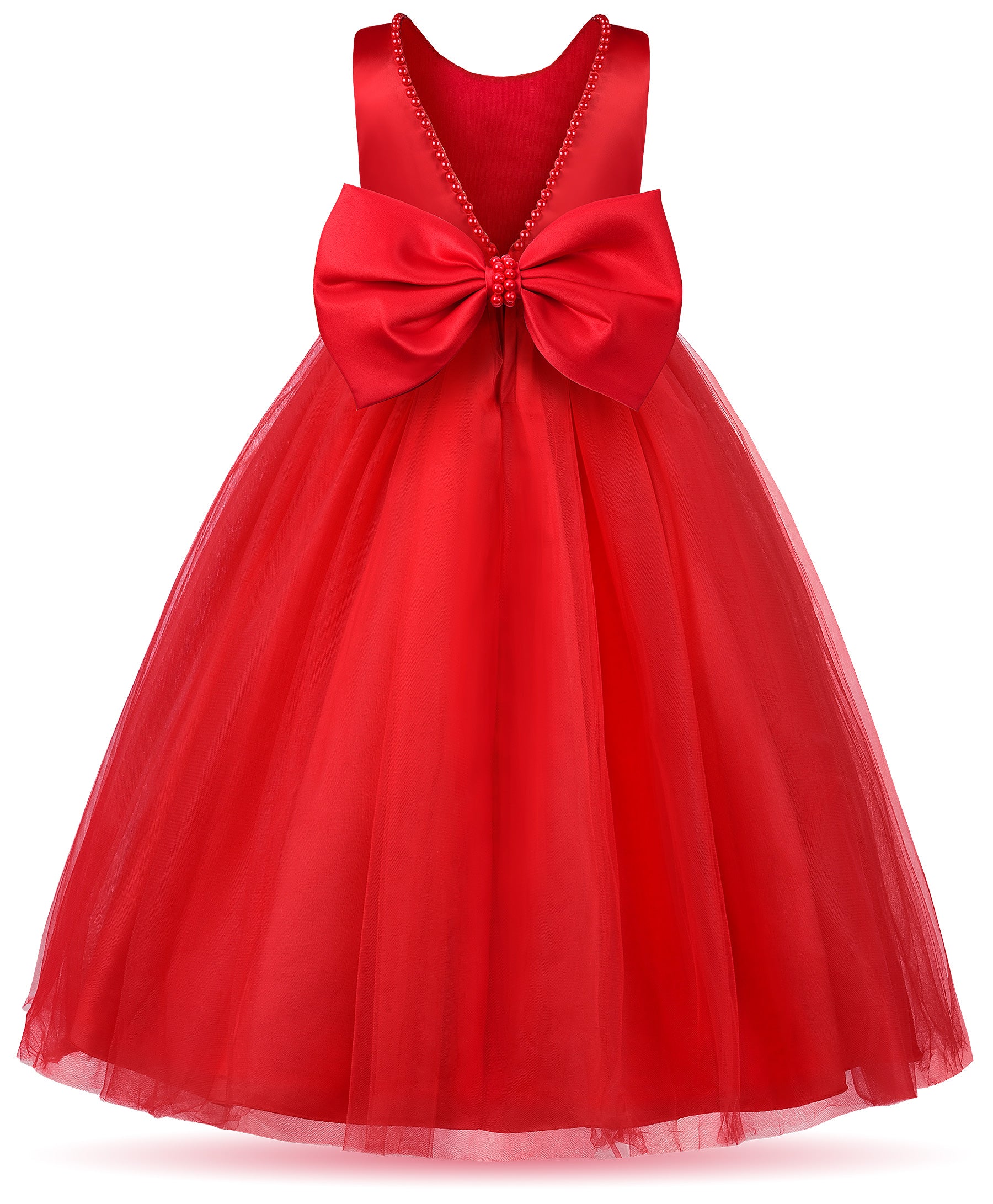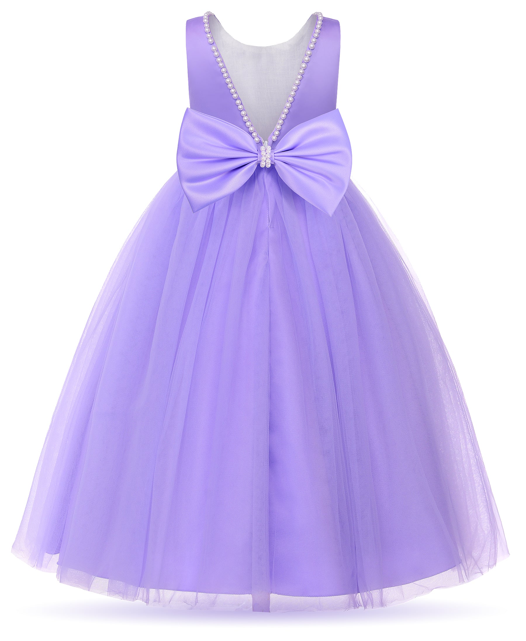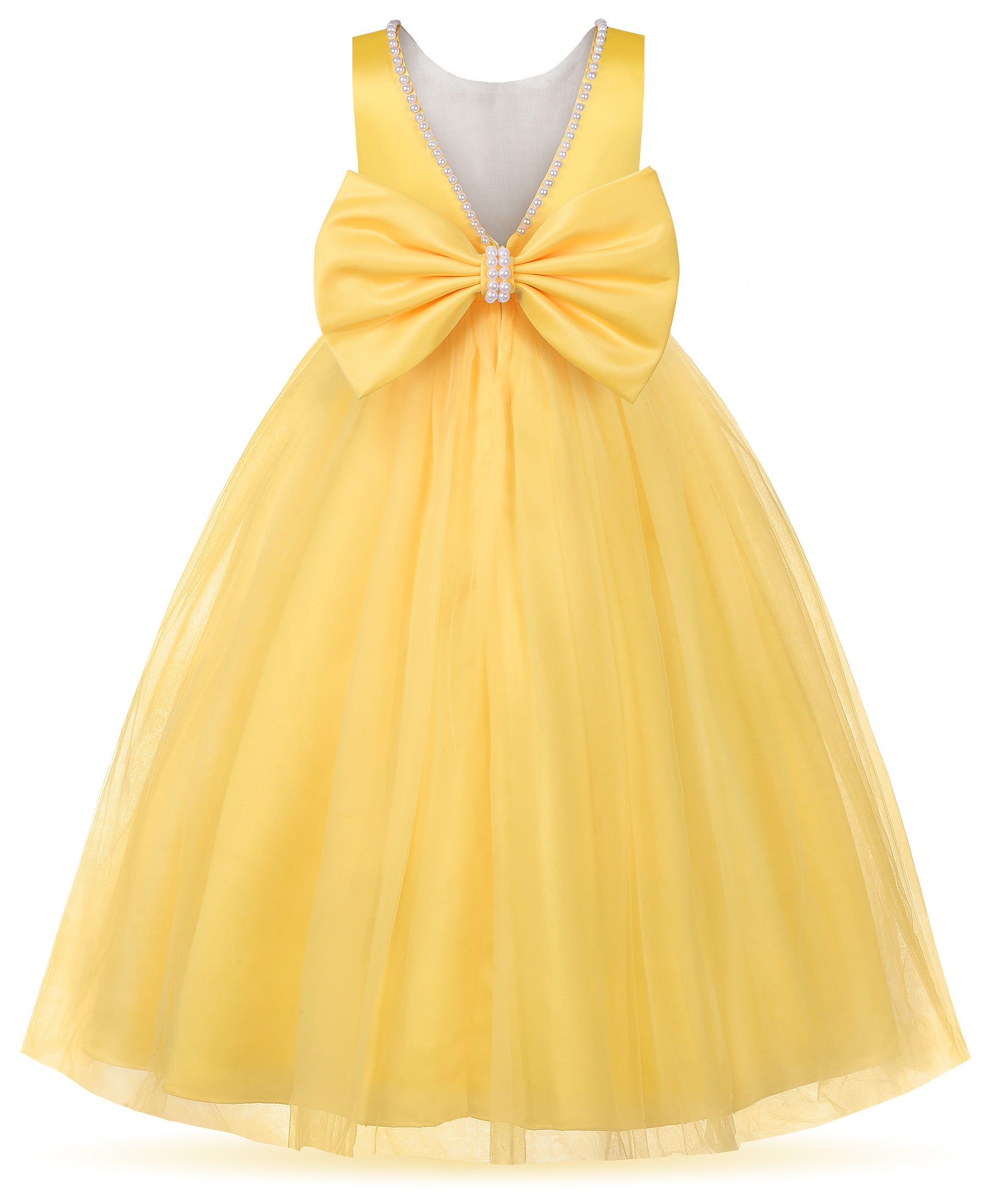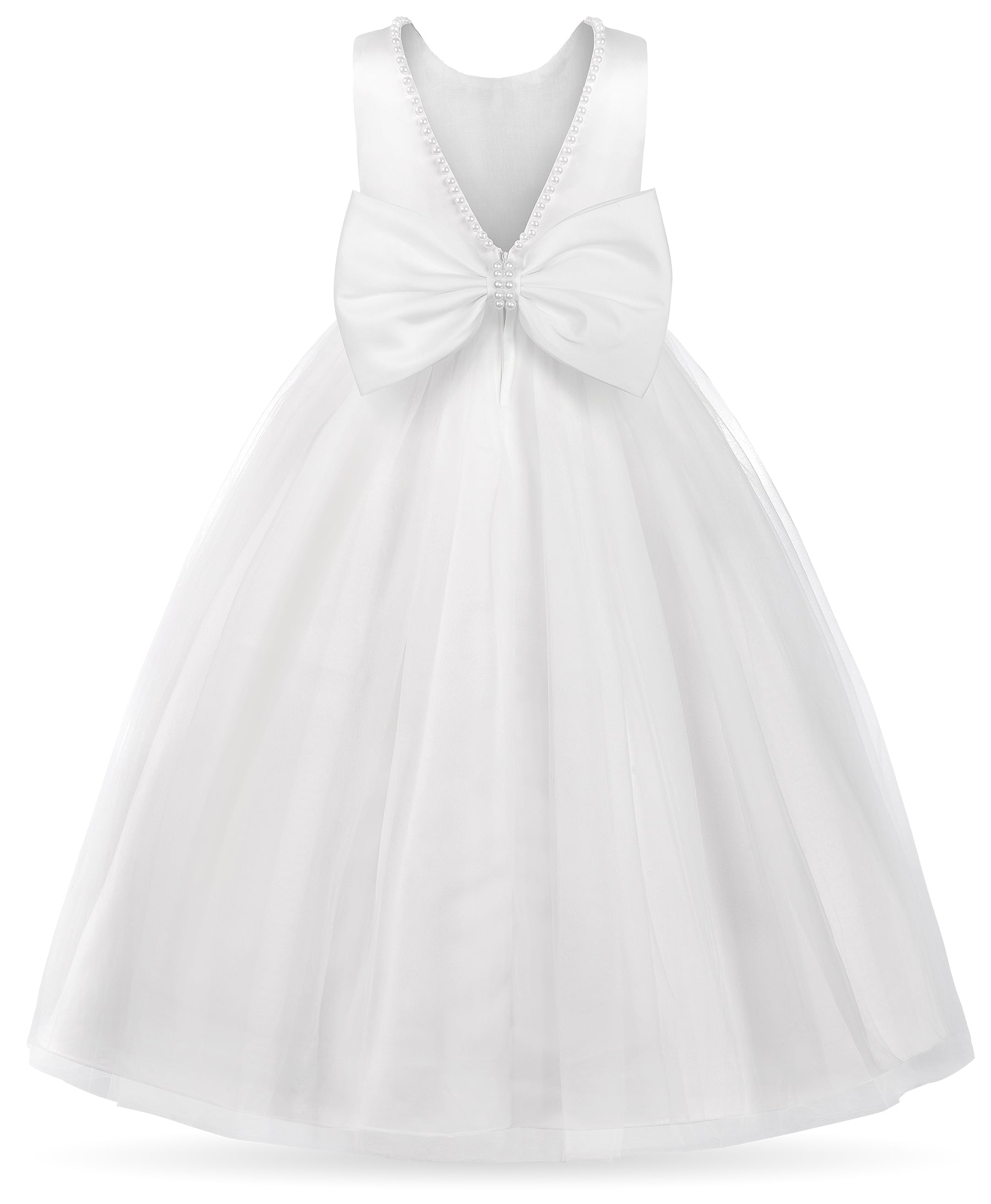 Flower Girl Pearls Dress V-Back Tulle Ball Gown Satin Prom with Bow-Knot for Wedding Pageant Birthday Party