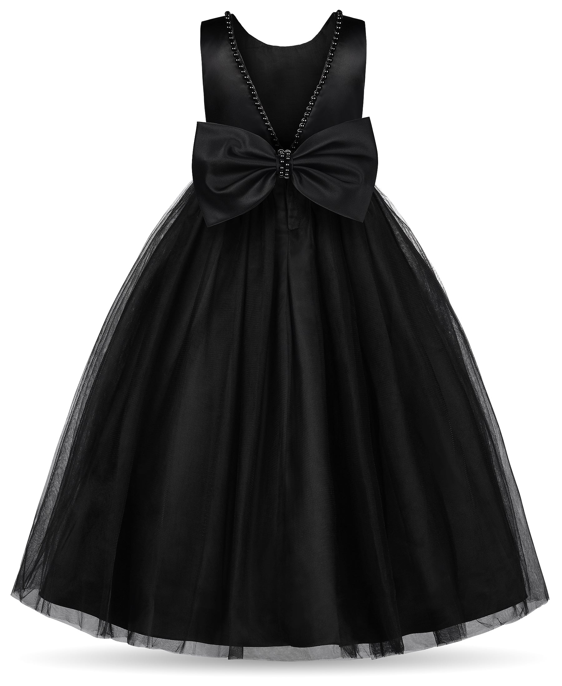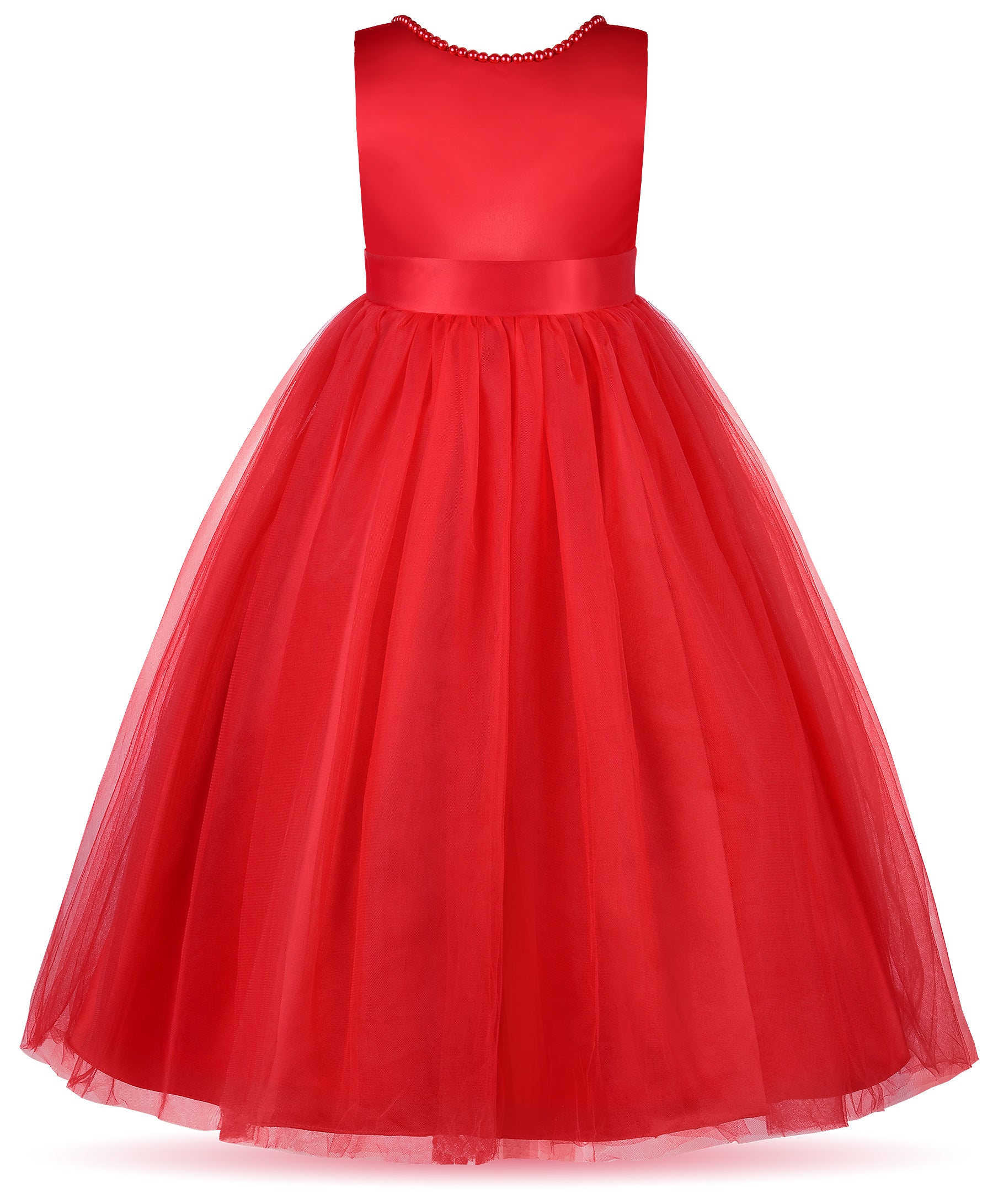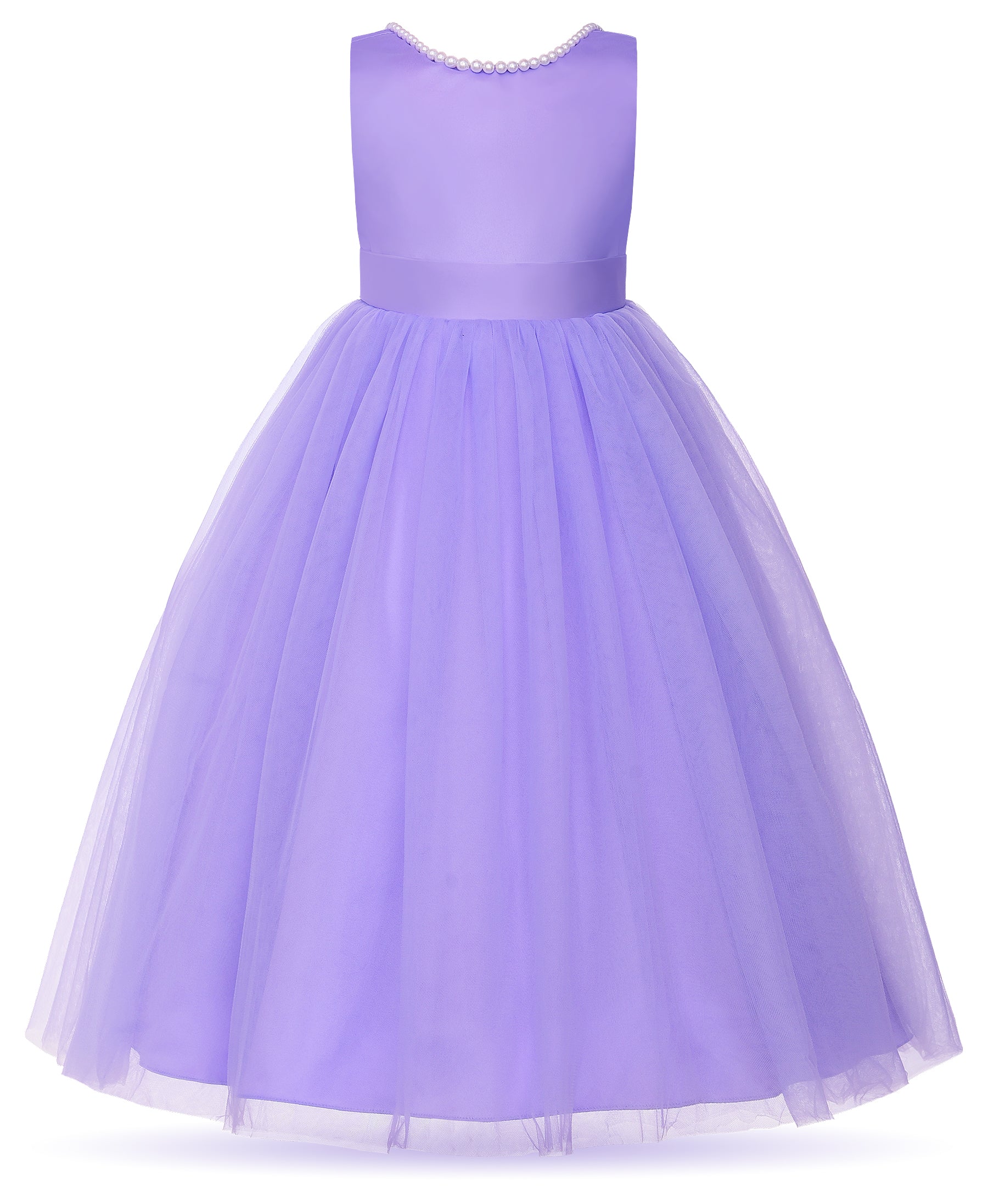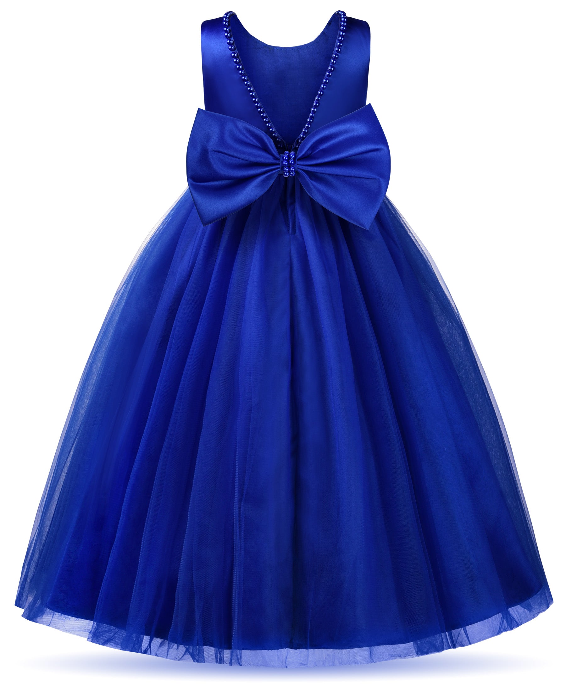 Flower Girl Pearls Dress V-Back Tulle Ball Gown Satin Prom with Bow-Knot for Wedding Pageant Birthday Party