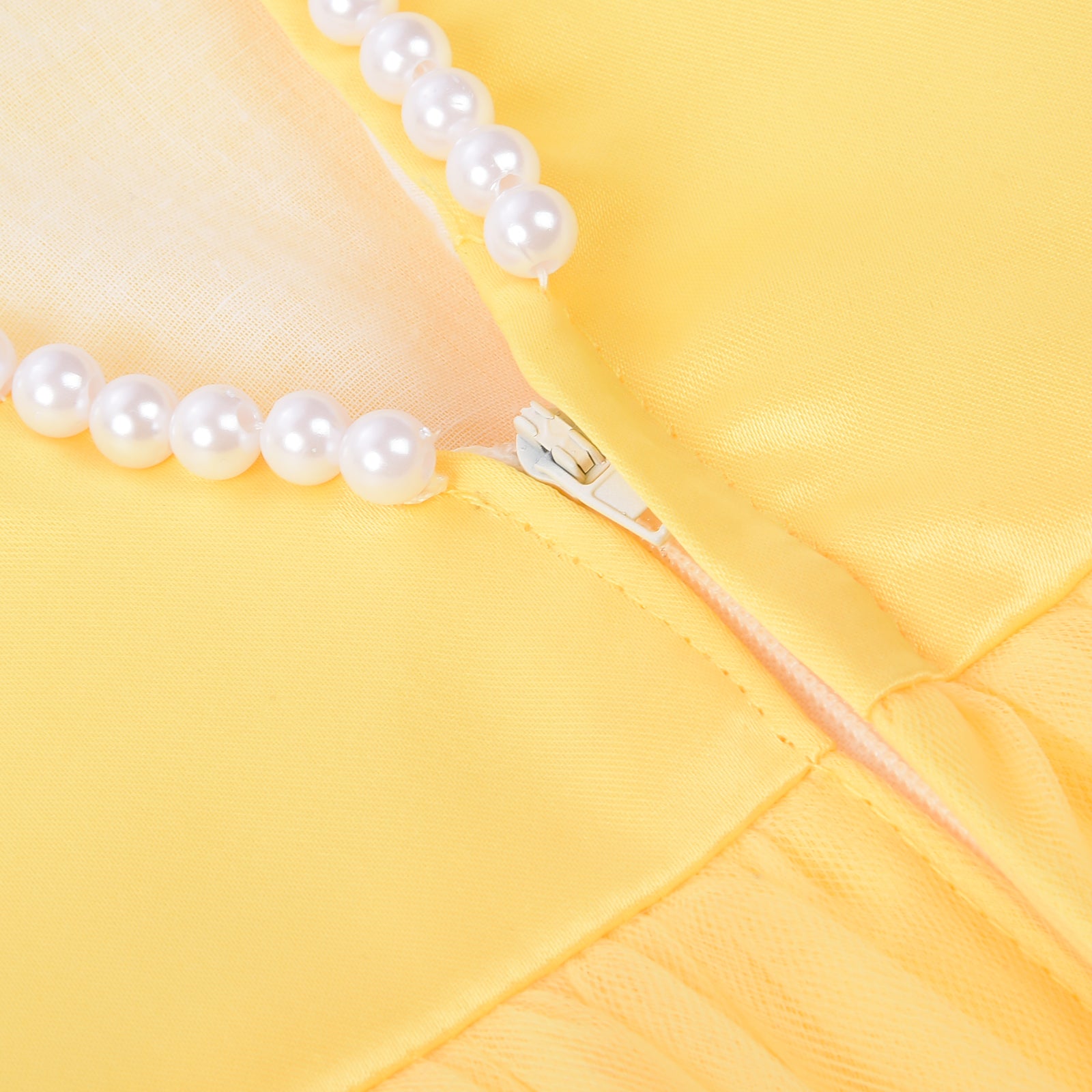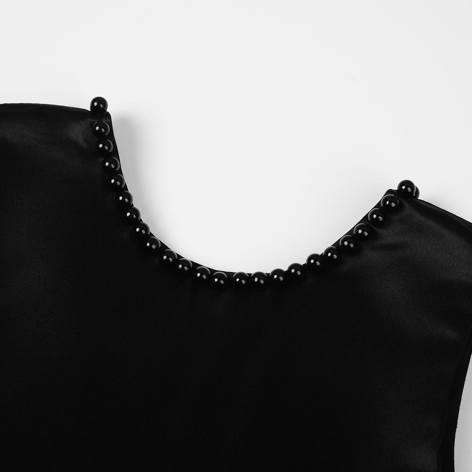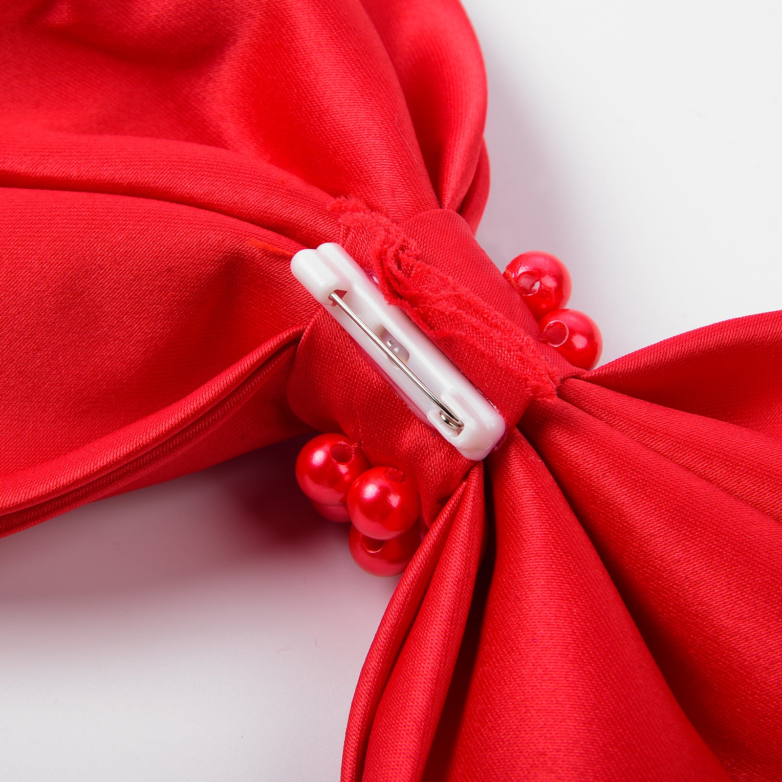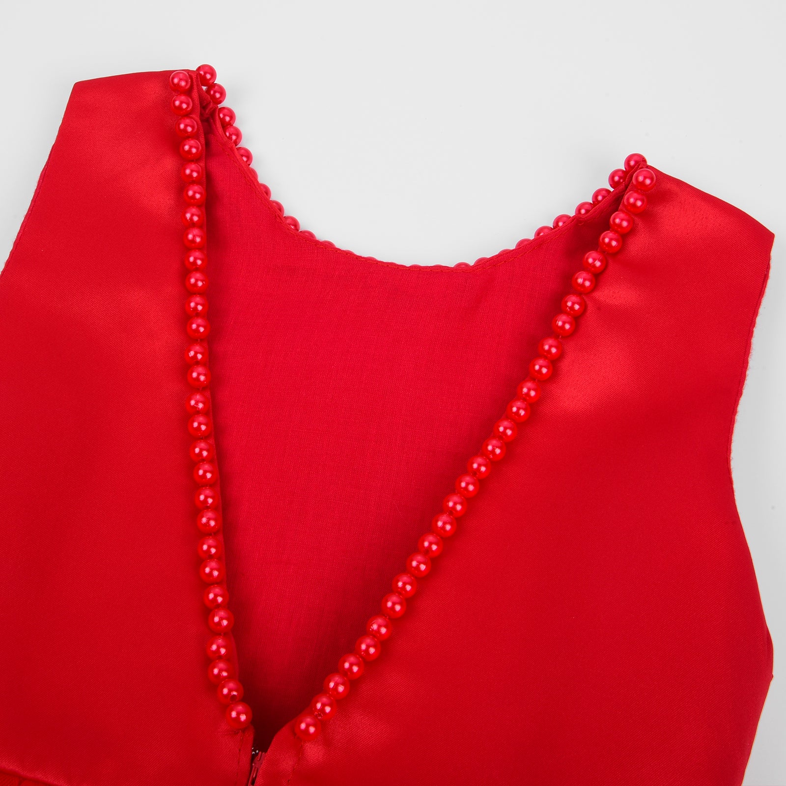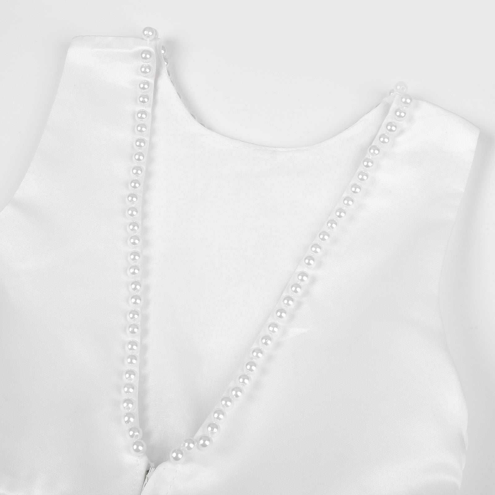 - Charming Details: The dress is adorned with a delicate pearl trim around the neckline and features a stylish deep V-back design with a large bow, adding a touch of sophistication and flair