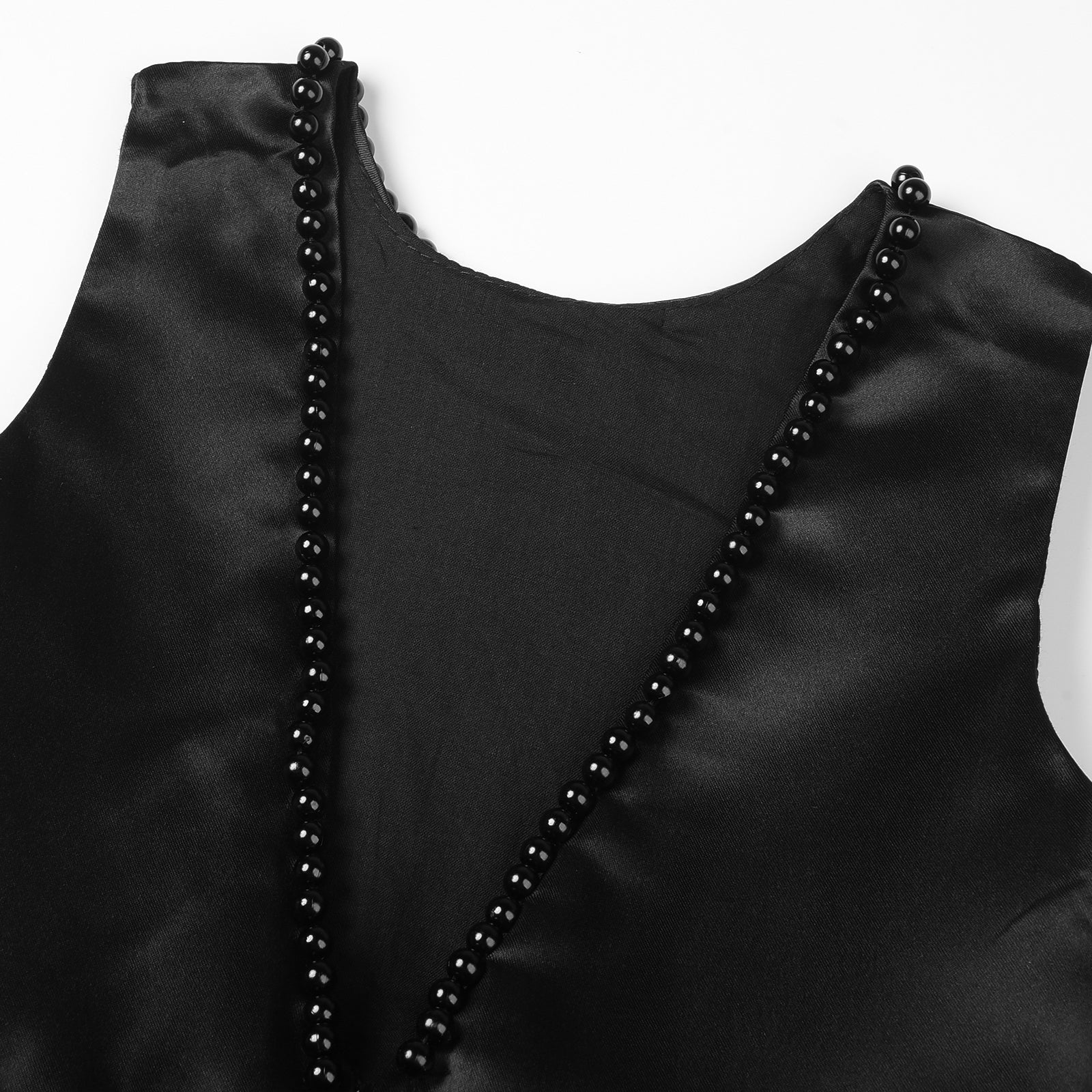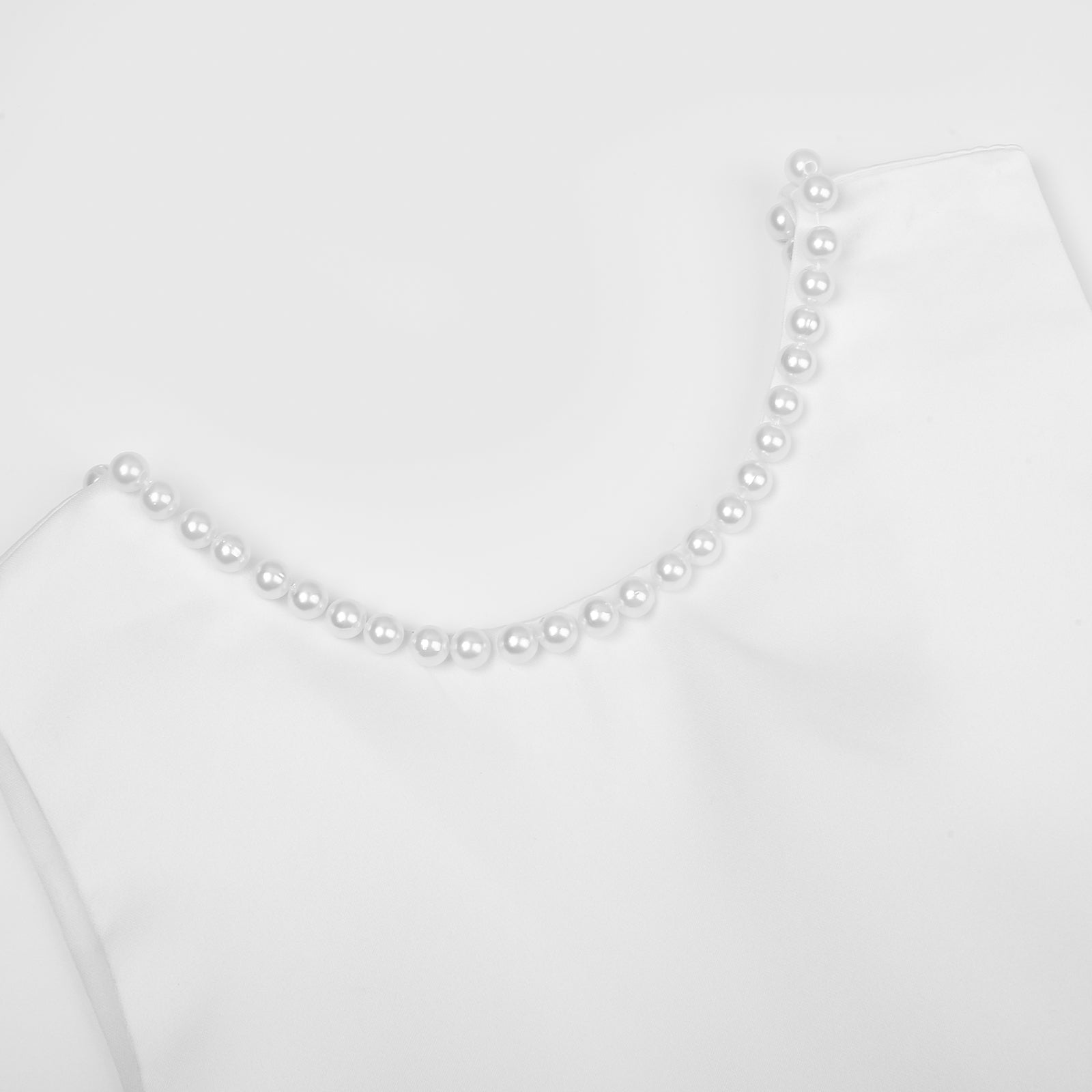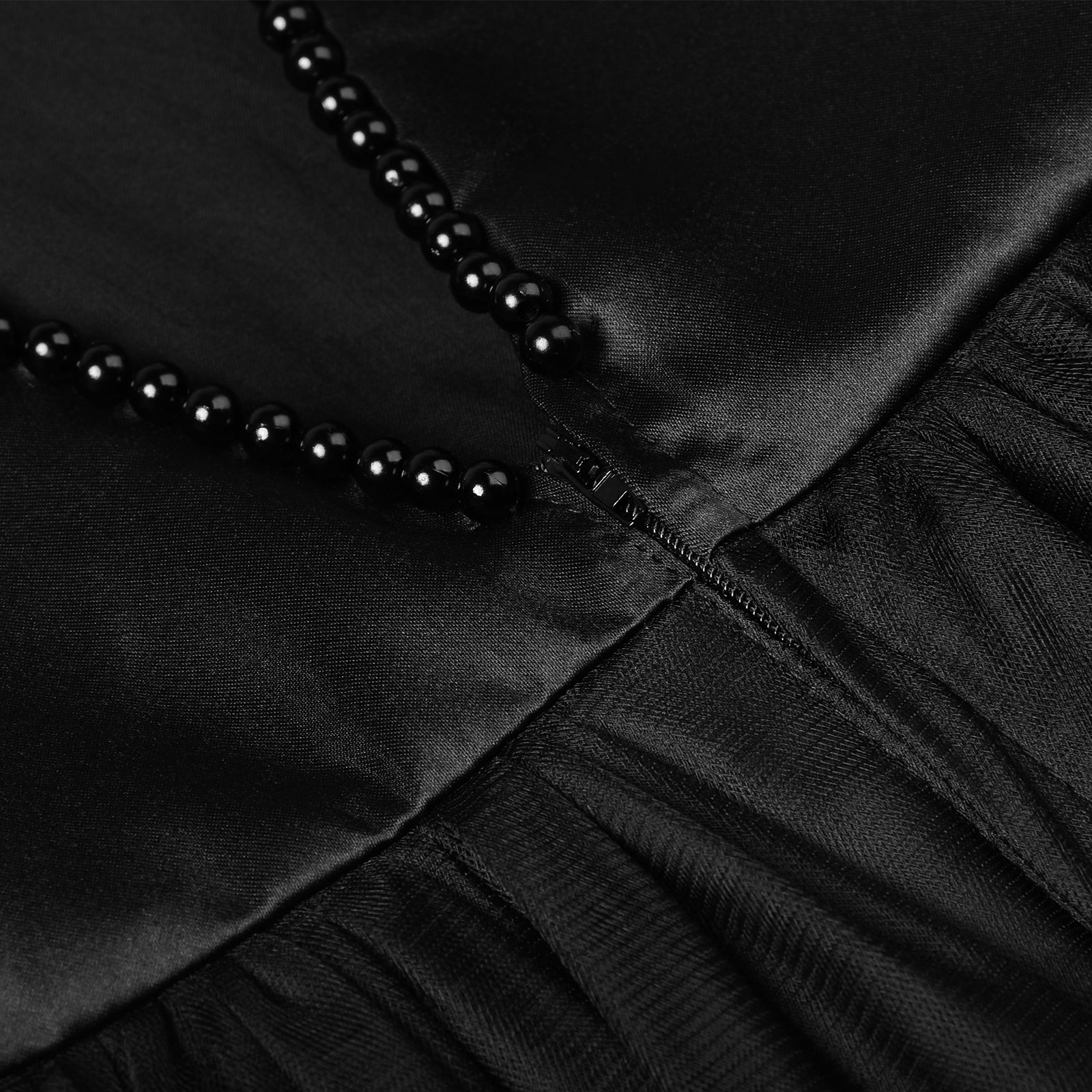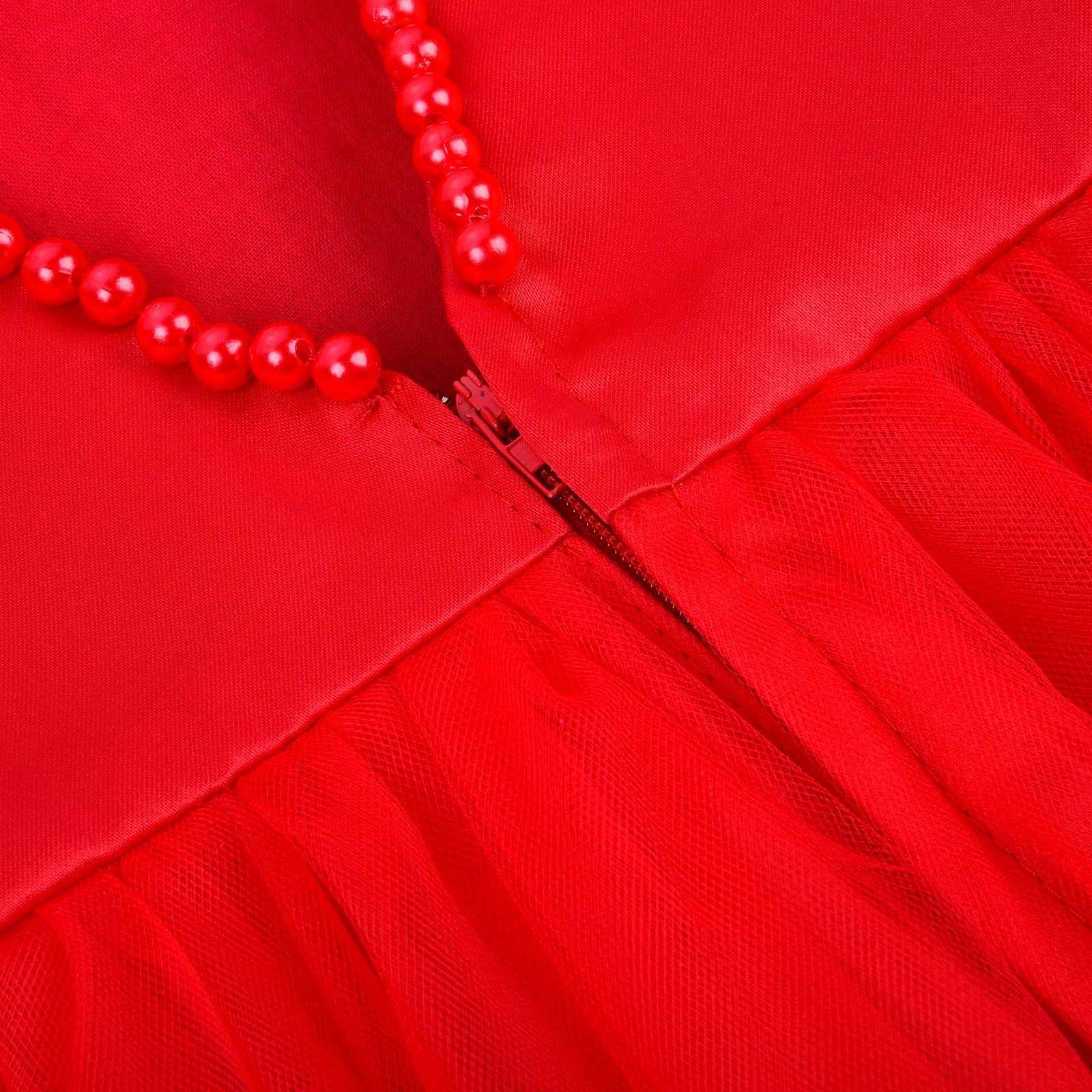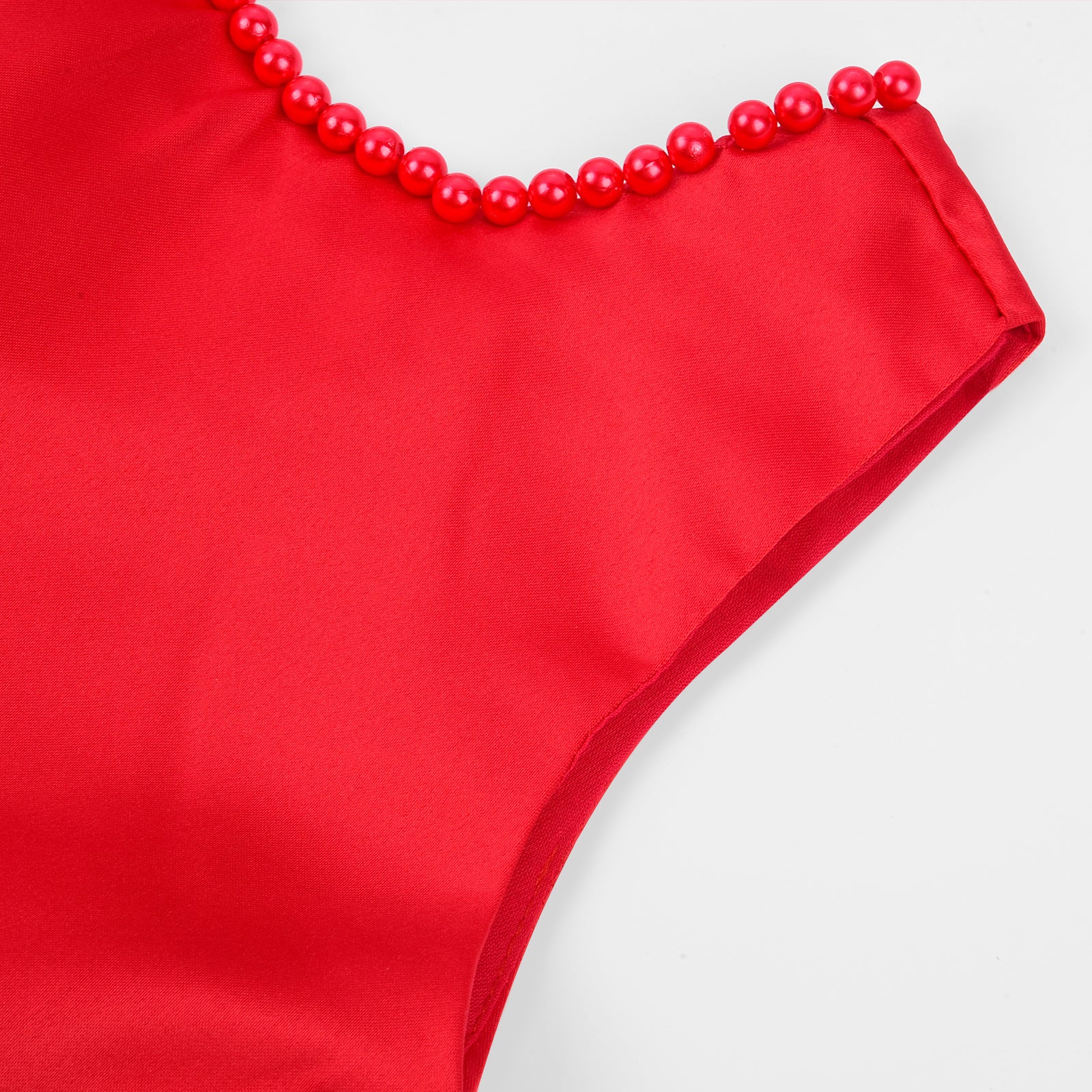 - Charming Details: The dress is adorned with a delicate pearl trim around the neckline and features a stylish deep V-back design with a large bow, adding a touch of sophistication and flair
