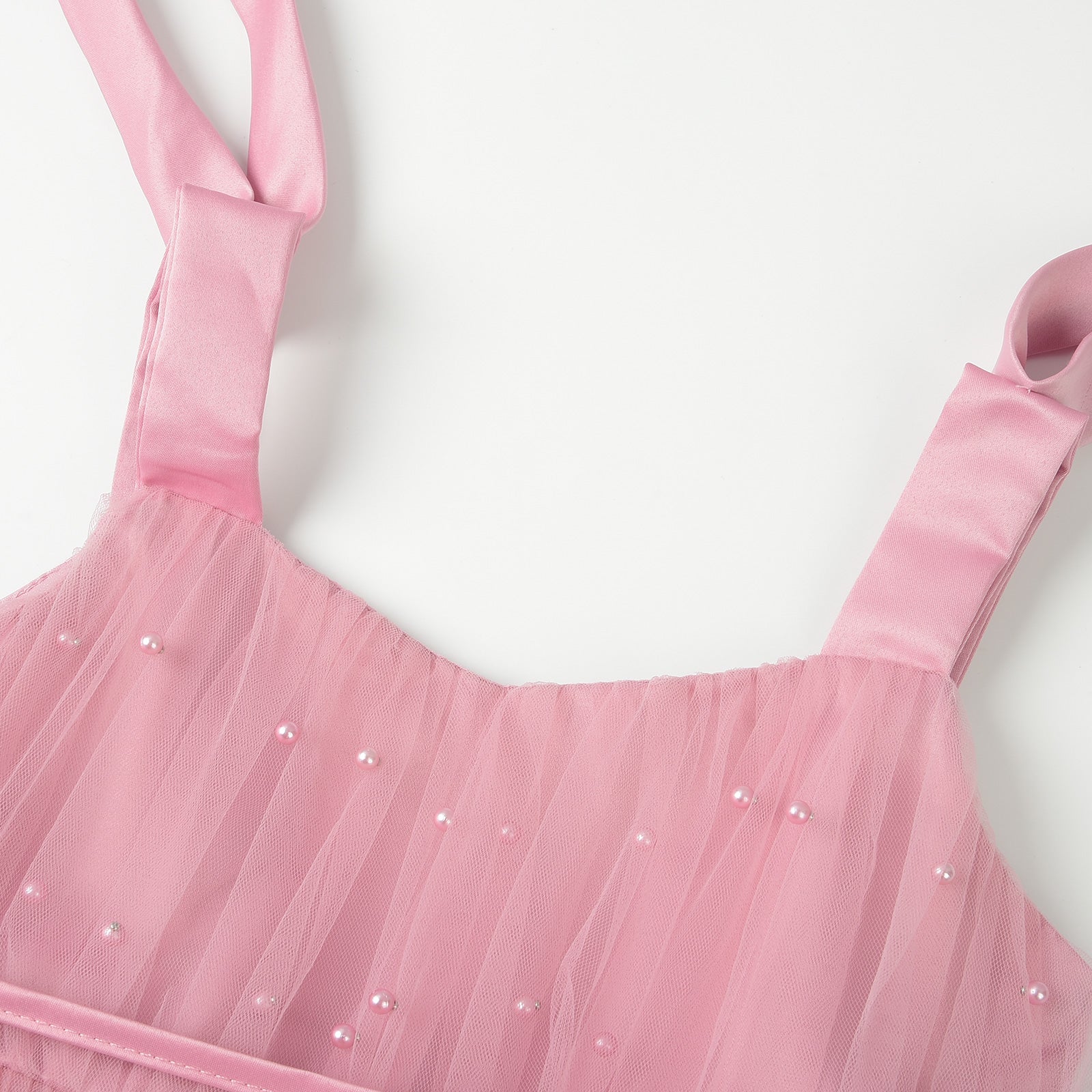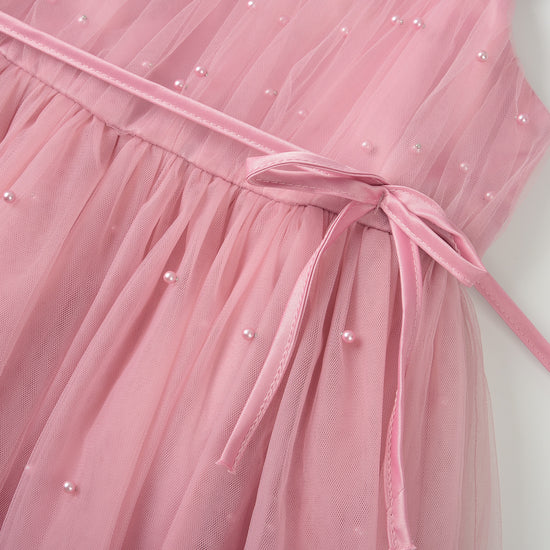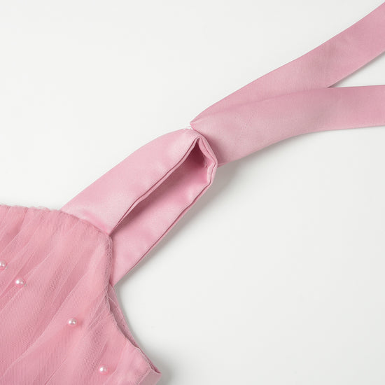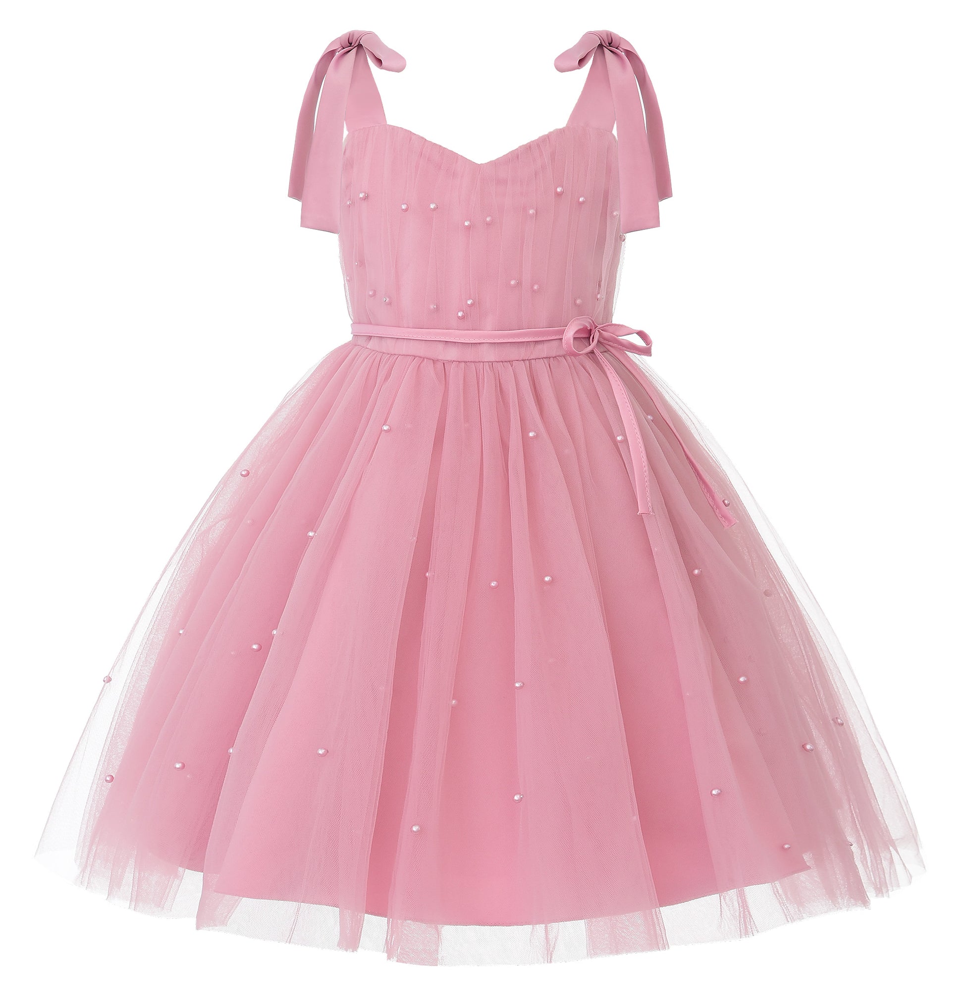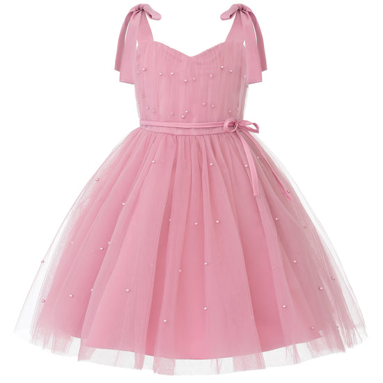 Flower Girls Pearl Dress Toddler Tulle Dresses with Bow Shoulder Straps for Wedding Party